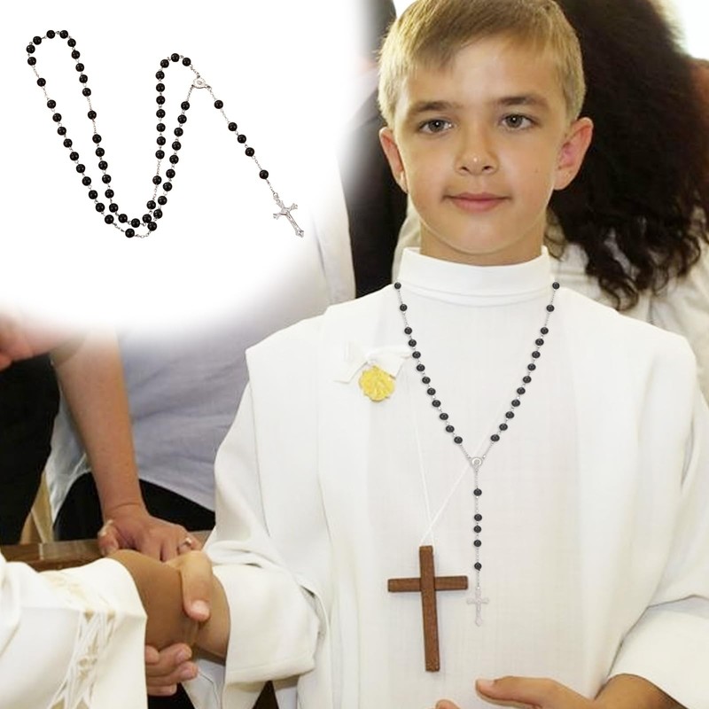 - Rosary chain size: the rosary necklace is 40 cm long. The extension to the cross is 6.8 cm. Fits easily over the head (the chain has no clasp). Available in black and white. Exquisite and elegant design with great attention to detail and excellent craftsmanship.