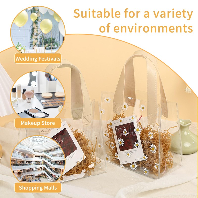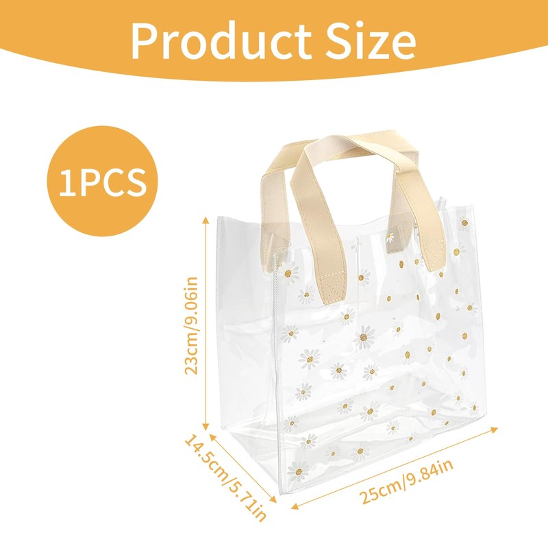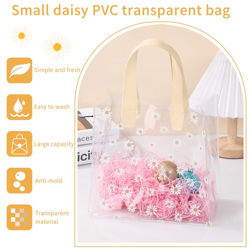 - Transparente Geschenktasche ist aus hochwertigem transparentem PVC, die sowohl verschleißfest und wasserdicht ist, die milchig weißen Griff passt perfekt mit dem kleinen Gänseblümchen Druck, können Sie es mit Bändern oder Anhängern schmücken, wird es sicherlich eine ideale Wahl für Ihre tägliche Geschenk geben oder Lagerung sein