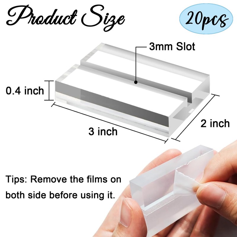 - Package Includes: 20 pack clear acrylic base, measures 3"x 2"x 0.4" with a 3mm wide slot. To prevent surface wear, each acrylic place card holder is double-coated with a protective film, please remove the film before use (Please note that the acrylic signs shown in the product images are NOT included).