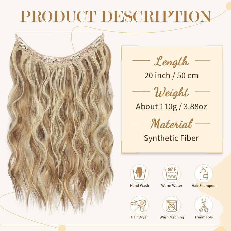 - Product Information: Each 20 inch invisible hair extensions includes: 4 BB clips auxiliary fixation, 2 different lengths of wire to adjust for replacement and can perfectly fit any head circumference. The hair is made from imported heat resistant synthetic fibres with a natural look and soft feel, perfectly mimicking real human hair while retaining its curl permanently, bringing you a whole new experience.