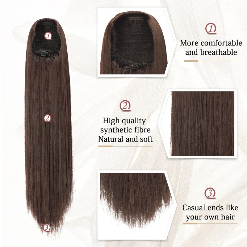 - Product design: long straight ponytail extensions with drawstring. Length: approx. 60 cm / 24 inches. Weight: approx. 135 g, comes with an elastic drawstring and 2 clips to ensure that the ponytail hair extension is fixed in place and does not slip easily; soft and breathable elastic inner mesh design makes it breathable and comfortable to wear, and will not damage your natural hair structure.