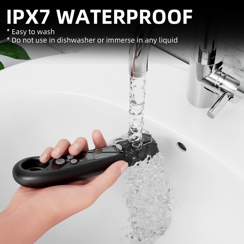 - Automatische Abschaltung und IPX7-Wasserdichtigkeit - Dieses digitale Lebensmittelthermometer kann zur Aufbewahrung und Abschaltung zusammengeklappt werden und schaltet sich nach 10 Minuten automatisch ab. Es ist leicht zu reinigen, kann unter fließendem Wasser gereinigt werden und ist nach IPX7 wasserdicht.(Nicht in der Spülmaschine verwenden oder in Flüssigkeiten eintauchen )