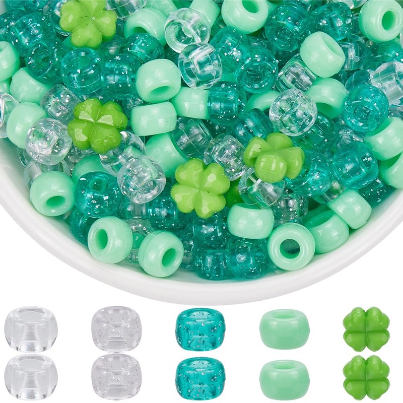 - Pack of 1000 green pony beads, multiple colours: you will receive 1000 pieces pony beads in 4 colours, including green, transparent, green glitter, clear glitter, 240 pieces. Each colour, and 40 clover beads, perfect for sharing with friends to St. Patrick's Day Crafts