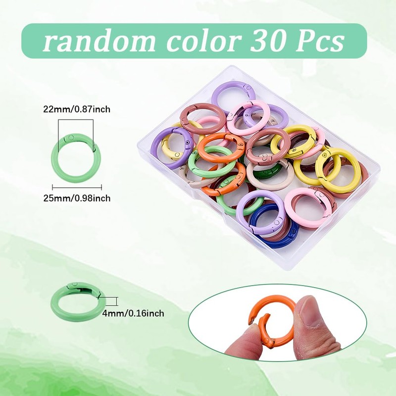 - 1 box of 30 round carabiner hooks: you will receive 30 spring O rings in random colours in a plastic box. There is enough for your daily uses and the plastic box is easy to store and organize.