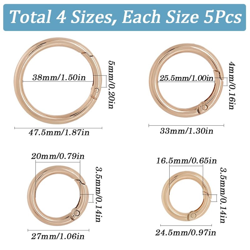 - Size and Content: Round carabiner clips are available in 4 sizes, 5pcs each size, 20pcs in total. Size: 33 x 4mm(1.3 x 0.16 inch), inner dia: 25.5mm(1 inch); 27 x 3.5mm(1.07 x 0.14 inch), inner dia: 20mm(0.79in); 24.5 x 3.5mm(0.97 x 0.14in), inner dia: 16.5mm(0.65in); 47.5 x 5mm(1.87 x 0.2in), inner dia: 38mm(1.5in)