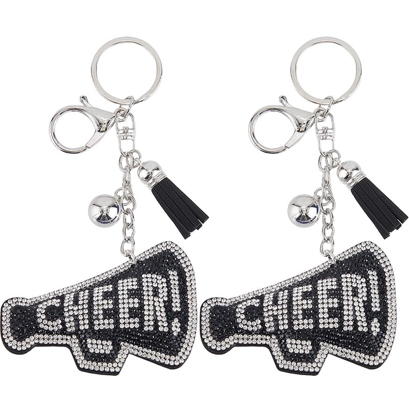 - Bling Keychain Accessories Design: This keychain charm is shaped like a trumpet with crystals spelling out the word cheer. With a cheerleader vibe, the black color scheme and white letters, it's classic, modern and versatile. Large size is easy to find