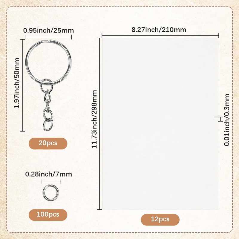 - 132Pcs Shrinky Sheets Keychain Kit: You will receive 12 sheets of clear shrink plastic sheets, 20pcs split key rings, and 100pcs jump rings. One side of each paper is frosted and the other side is smooth. Please note to use the frosted side for printing for best results