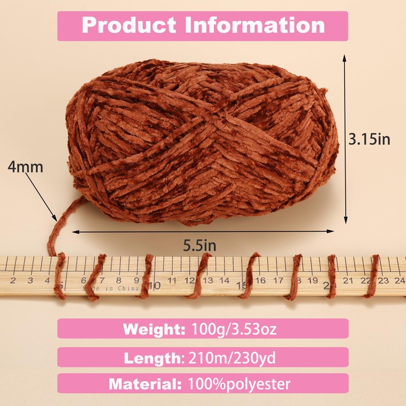 - Soft Chenille Yarn:This soft yarn for crocheting is 100g/3.53oz,210m/230yard,#4 Medium,Thickness:4mm.Rod needle size:4.5mm,Crochet hook size:4mm.