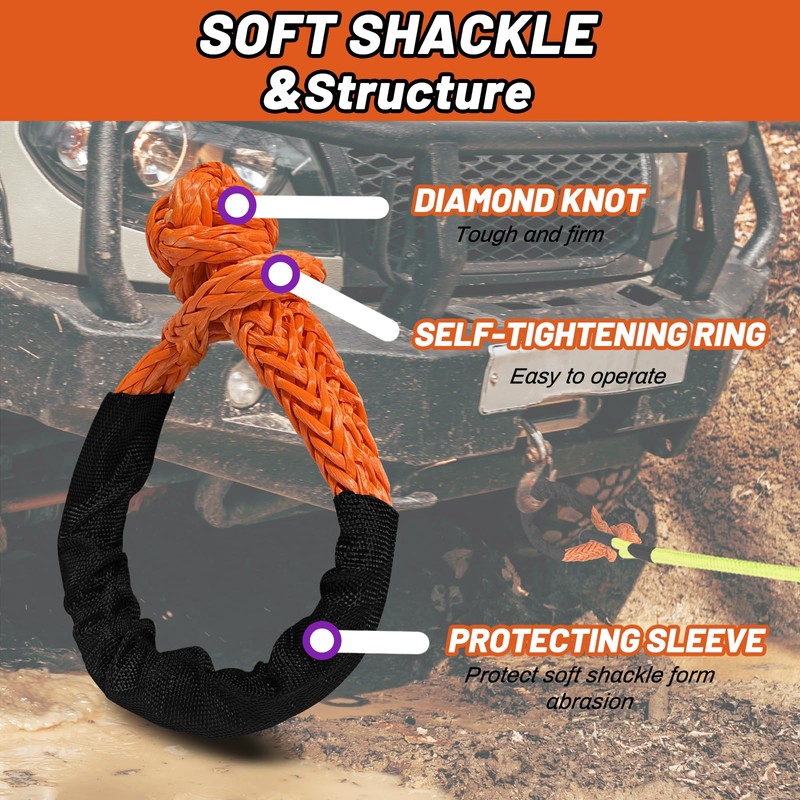 - Widely Used, Suitable for Various Scenarios:It is an ideal choice for the soft shackle recovery kit, suitable for vehicles such as 4x4s, UTVs, SUVs, ATVs, trucks, etc., as well as various scenarios such as mountaineering, trailer recovery, agriculture, sports off-road vehicles, boating, outdoor adventures, etc., meeting the different usage needs of users.