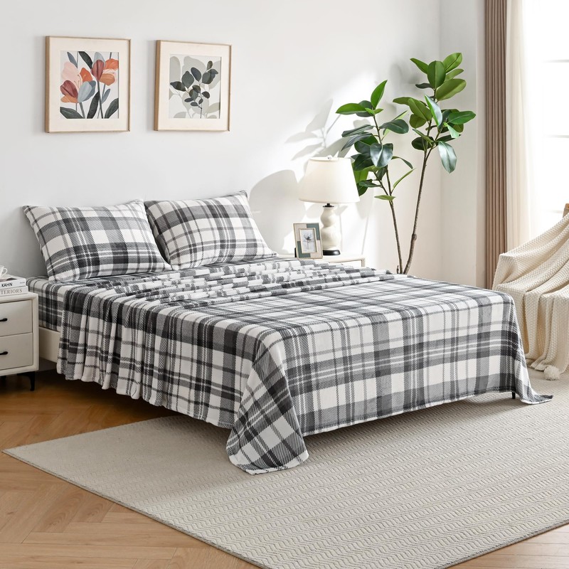 Softan Queen Micro Fleece Sheets Set, 4-Piece Queen Size Bed Sheet Set, Plush Velvet Fleece Sheet Set with 15" Deep Pocket Fitted Sheet, Flat Sheet, 2 Pillowcase, Soft and Warm, Grey White Plaid