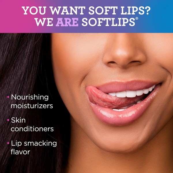 YOU Want Softlips? We Are Softlips. Pamper your lips with soothing Softlips lip protectant. This 3-pack of lip balms is designed to provide intense lip hydration, leaving lips feeling soft and smooth. The lip-smacking flavors add a touch of sweetness to your daily lip care routine and the dermatologist-tested formula ensures that you can trust the quality and safety of Softlips lip protectant. This 3-pack of Watermelon, Cherry and Vanilla Softlips chap sticks are cruelty-free, paraben-free, phthalate-free and gluten-free*. The compact and portable design allows you to take Softlips Lip Protectant wherever you go C slip it in your pocket or purse for on-the-go lip hydration, ensuring your lips stay moisturized and protected throughout the day. Experience the perfect blend of hydration and delicious flavors with Softlips Lip Protectants. Try all Softlips products: Softlips Classics come in a variety of fun flavors, Softlips Naturals use 100% natural ingredients, and Softlips Seasonals make fun and thoughtful gift-giving. *Softlips contains no ingredients made from gluten-containing grain (wheat, barley, or rye). Made in the USA with global ingredients. Use as directed.