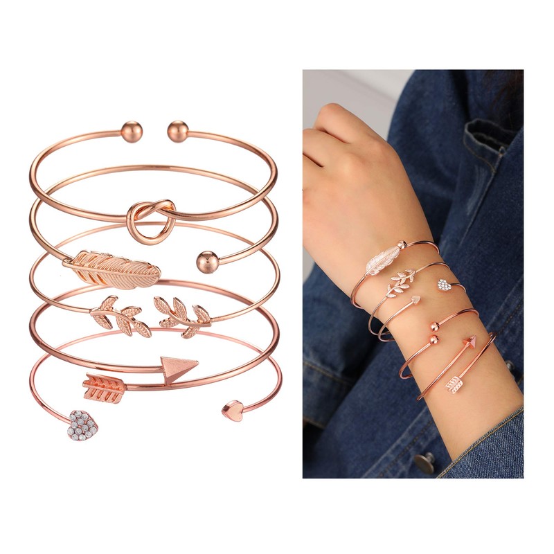 Softones 5pcs Bangle Rose Gold Bracelets for Women Heart|Olive Leaf|Arrow|Feather|Knot Heart Open Cuff Bracelet Set Adjustable
