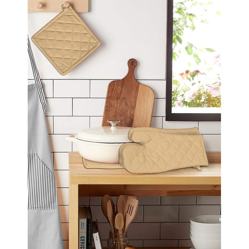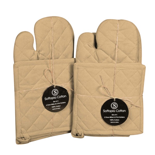 Softopia Cotton Oven Mitt (7"x13") & Pot Holder (8"x8") 100% Cotton Set of Heat Resistant Oven Gloves & Hot Pads for Gifts, BBQ, Cooking, Baking, Thanksgiving - Beige