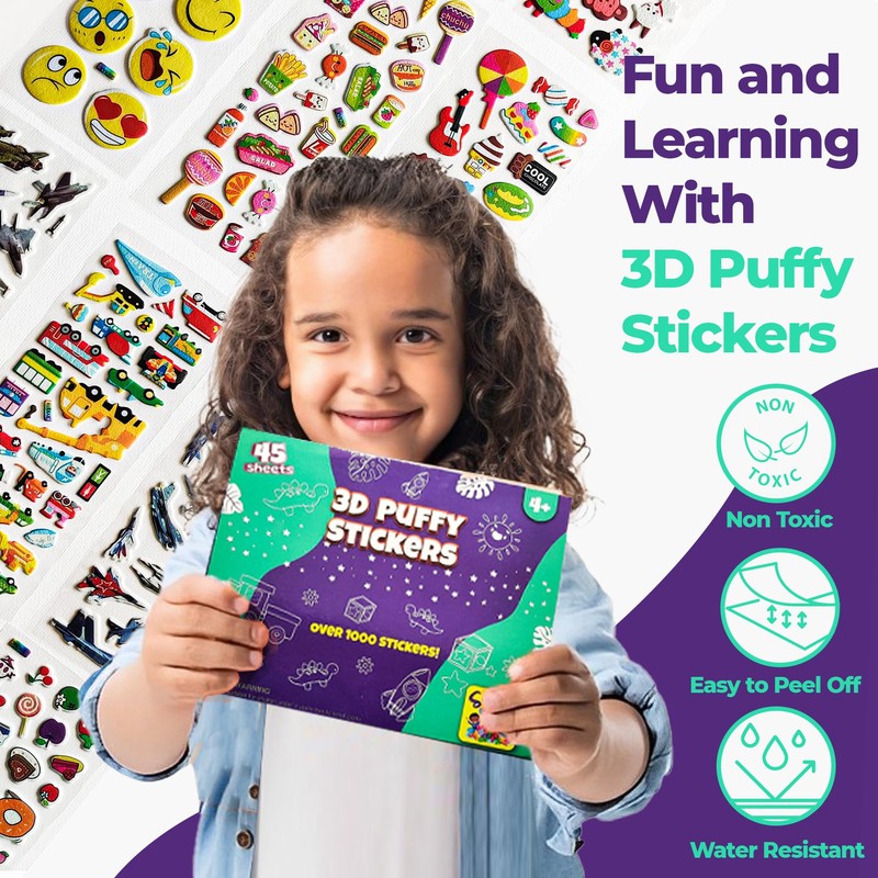 SOFTZO 3D Stickers for Children - 45 Puffy Sheets with 1000+ Kids Stickers - Perfect for Party Bag Fillers, Scrapbooking, Fun with Stickers of Cars, Letters, Numbers, Dinosaur, Stars, Alphabet & More