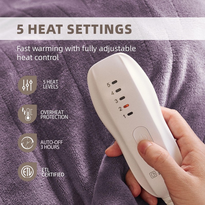 SOGANASA Heated Blanket Throw 50"x60" - Machine Washable Electric Throw Blanket Office Heated Throw Blanket with ETL & FCC Certification 5 Heating Levels 3 Hour Auto-Off Overheat Protection(Purple)