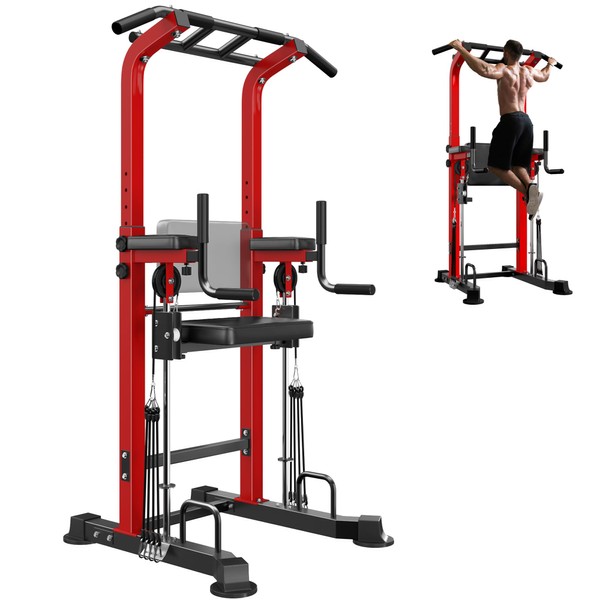 soges Power Tower Dip Station with Assisted Pad, Height Adjustable Pull Up Bar Station for Home Gym, Multi-Function Strength Training Full Body Workout Equipment, 330 Lbs, Red