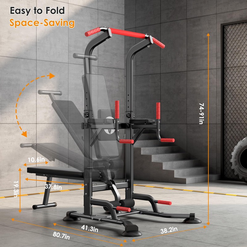 - 💪【Power Tower with Folding Bench】:Our weight bench features a unique triangular stabilizing design, made of high quality waterproof PU leather and padded with soft foam cushions for maximum comfort during any workout. Ideal for standing upright, inclining, or lying flat, the thick foam cushions provide better support for the exerciser's back and neck, thus reducing stress and discomfort on the body. Folds up when not in use, perfect for small spaces.