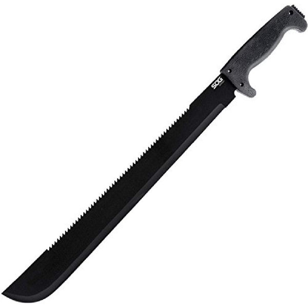 The SOG Specialty Knives & Tools MC02-N SOG Fari features a real working saw on the back of the blade and is one of the most useful tools in the world, having cleared brush, blazed trails, chopped wood, made shelters and helped harvest crops. Made of 3CR13 steel with an attractive black powder coated finish, the 18-inch saw back with a fixed blade has a machete shape that can be used for survival exploration and clearing trails. The ergonomically contoured and well balanced handle has a black finish and is made of Craton to comfortably fit in your hand. The handle’s synthetic rubber material provides a no-slip surface with increased heat resistance, weathering and chemical resistance. There's a lanyard hole on the base of the handle. A black nylon sheath is included with a hook and loop closure and belt loop attachment to keep the safely protected and close to you at all times. This knife has an overall length of 24-inches, blade thickness of 0. 08-inches and weight of 15. 7-ounces. The SOG Specialty Knives & Tools MC02-N Machete with 18-Inch Dual Steel Straight Edge and Saw Blade comes with a limited lifetime that protects against defects in manufacturing and materials. Each SOG product is created with the help of company founder and chief engineer, Spencer Frazer. Known for their uncompromising style and performance, these knives and tools showcase innovation, dependability and a unique, futuristic style that has garnered awards and recognition worldwide. SOG products have also won favor among law enforcement, military and industrial customers that rely on their tools to perform flawlessly in the toughest, most adverse conditions.