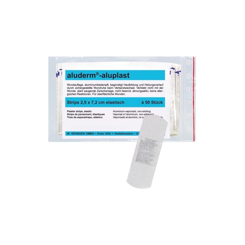 - aluderm-aluplast is the special wound dressing plaster with aluminium-steamed aluderm wound dressing and absorbent fleece