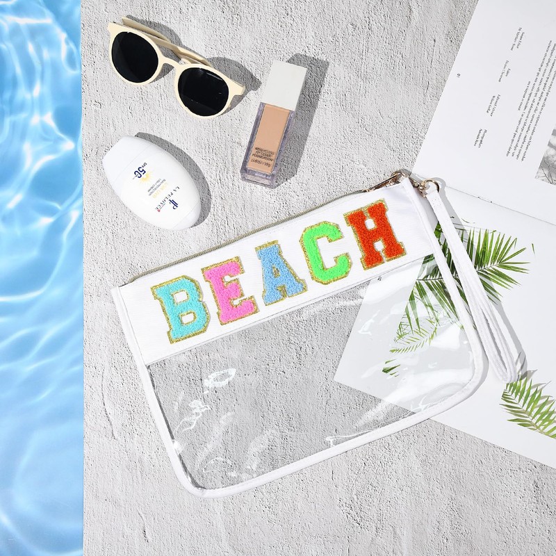 - Glitter Chenille Letters: Clear makeup bag comes with the BEACH chenille letter patches.These colorful letters have a fun glitter border that is sure to stand out from all of your other cosmetic toiletry bags!