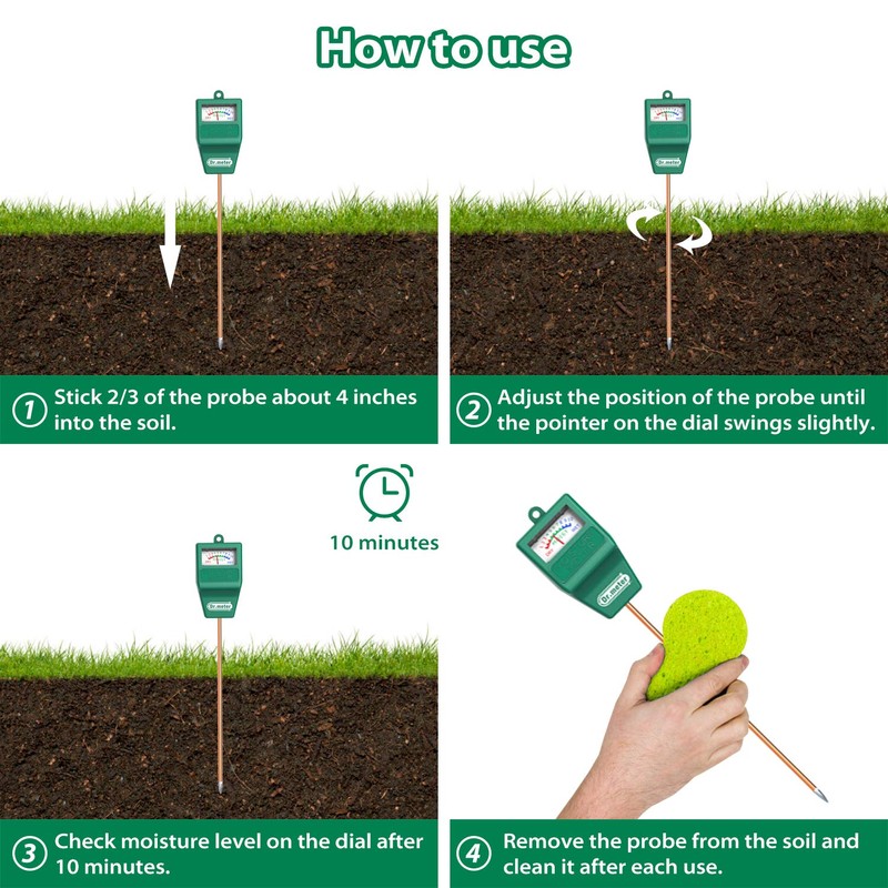 - ▶ 【Helpful Tips】The Dr.meter Soil Moisture Sensor Meter is designed only for soil testing and should not be used in liquids. Keep it away from rocks and extremely hard soil to avoid damaging it. Make sure to clean the probe after each use.