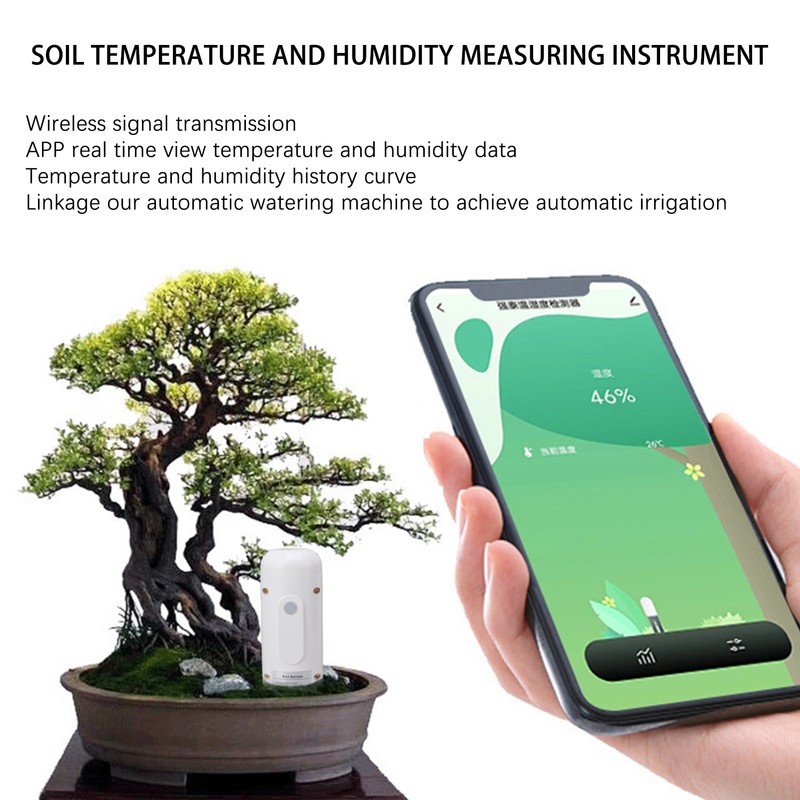 1、Wide Application: The soil tester is suitable for a wide range of soils and can be used in various places such as potted flower boxes, courtyard gardens, farmland vegetable plots, greenhouses, lawns, etc. 2、APP Control: Digital soil tester adopts wireless signal transmission, APP real time view temperature and humidity data, temperature and humidity history curve, linkage APP automatic waterer to realize automatic irrigation. 3、Stainless Steel Probe: Soil moisture meter's probe is made of austenitic 304 stainless steel to prevent rust, electrolysis, acid and alkali corrosion, to ensure the long term operation of the probe. 4、IP67 Waterproof: Soil tester's protection level is IP67, which can prevent water from entering the inside of the body and has better sealing performance. 5、Superior Performance: Soil moisture meter has industrial grade performance, low power consumption, highly sensitive measurement, stable performance.