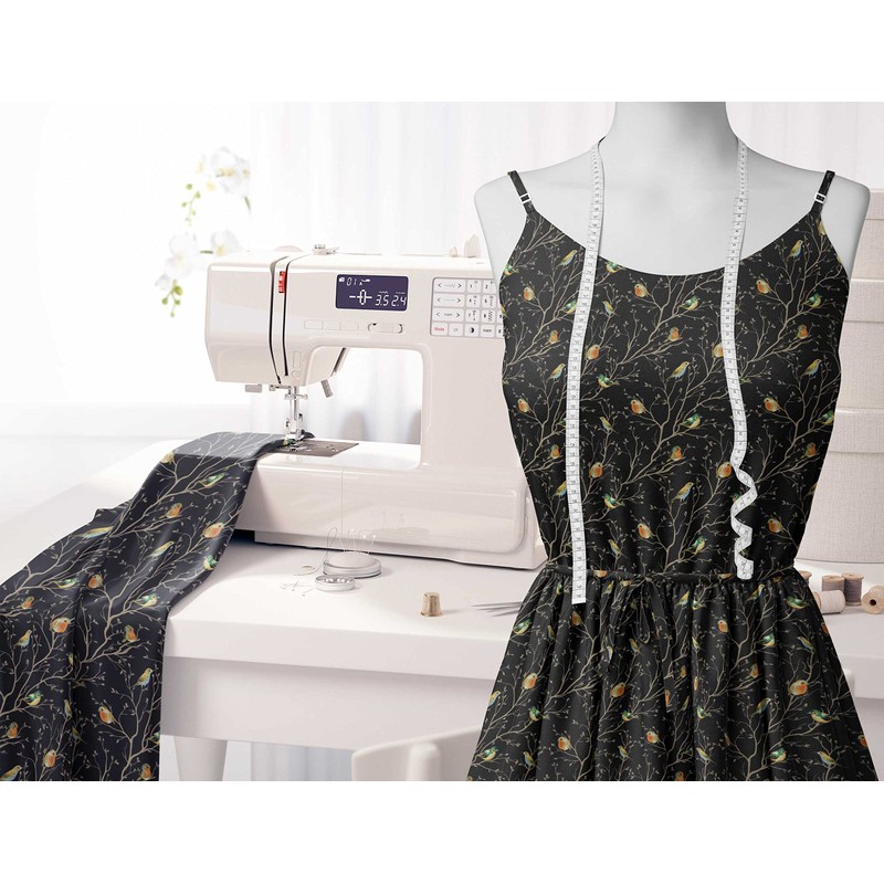 Soimoi Black Cotton Canvas Fabric Leaves & Flowerpecker Bird Fabric Prints By metre 44 Inch Wide