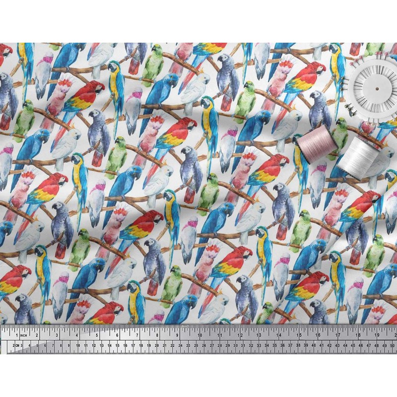 Soimoi White Cotton Canvas Fabric Branch & Colorful Parrot Bird Print Fabric by the metre 56 Inch Wide