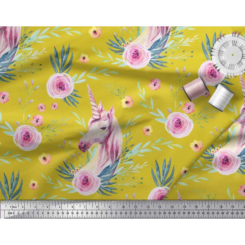Soimoi Yellow Viscose Chiffon Fabric Unicorn Face & Ranunculus Floral Printed Fabric 1 metre 42 Inch Wide