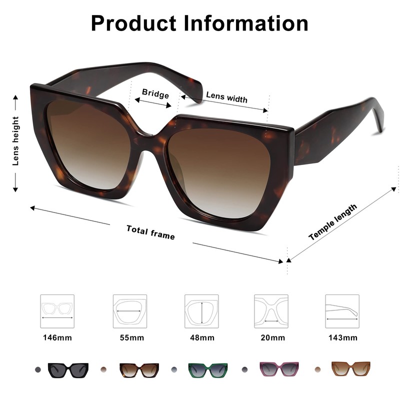 - anteojos de sol cuadradas de moda de gran tamaño: estas anteojos de sol cuadradas de moda se mantienen al día con la última tendencia de moda. Los marcos cuadrados de gran tamaño pueden combinar con varias formas faciales. Una variedad de colores de lente puede combinar con diferentes atuendos a la moda diaria.