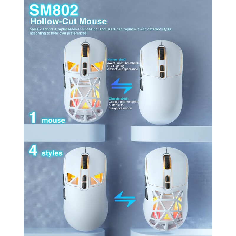 - Replaceable microswitch:SM802 gaming mouse wireless is a personalized mouse that supports high customization. It is equipped with two types of switches, game microswitch and office silent microswitch.Users can replace different micro switches according to their own needs, or switch from other brands on the market