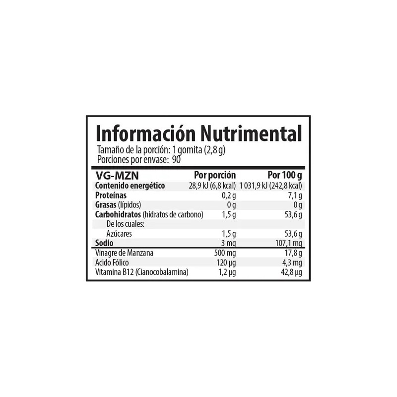 INGREDIENTES: Azúcar, Jarabe de Glucosa, Vinagre de Manzana (Malus domestica), Grenetina, Agua Purificada, Jugo Concentrado de Manzana (Malus domestica), Acido Cítrico, Pectina, Citrato de Sodio, Color Caramelo Clase IV, Color Natural Rojo #4 (Coccus cacti), Ácido Fólico, Vitamina B12 (Cianocobalamina), Cera de Carnauba (como abrillantador).