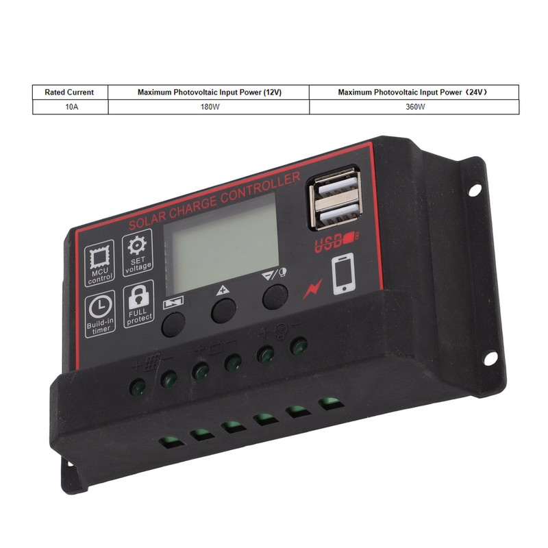 Solar Charge Controller Solar Panel Battery Intelligent Regulator with Dual USB Port 12V/24V PWM Auto Paremeter Adjustable LCD Display10A