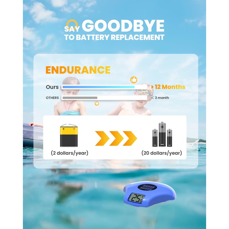 Solar Digital Pool & Spa Thermometer, Weather Resistant Floating Thermometer, IPX-8 Water Proof, 10s Measuring Cycle, Solar Powered with Over 180 Days Battery Life