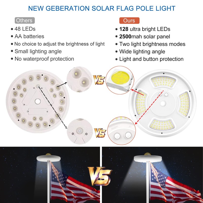 - ✨【 128 LEDS SUPER BRIGHT LIGHT AND 2500 MAH BATTERY 】 ZIOTI solar flag pole lights have a built-in 2500mAh solar rechargeable battery and 128 super-bright led energy efficient bulbs, which is the brightest flag light in the market. After a full sunny day of charging, it can work up to 10 hours at night.