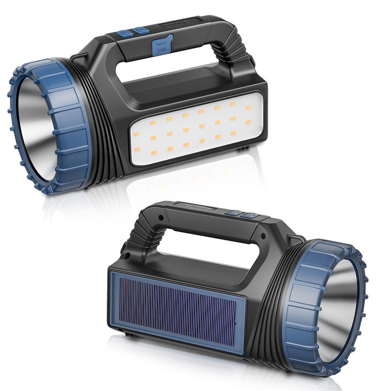 - 【SOLAR FLASHLIGHT WITH USB CHARGER】:It has two charging modes: Usb-c and solar energy. The normal charging uses usb-c, and the newly designed solar panel charging can solve the problem of being unable to charge for a long time in an outdoor emergency. As long as you are in the sun, you can replenish energy anytime, anywhere. Uniform high-brightness light source, more stable illuminance with spotlight design. And it can output power to charge cameras, mobile phones, laptops and other devices anyt