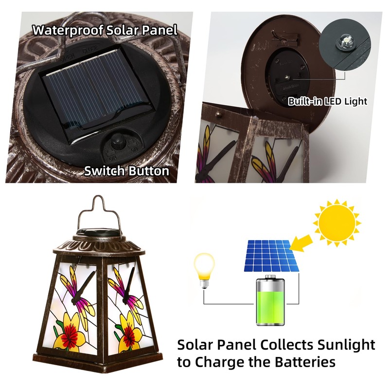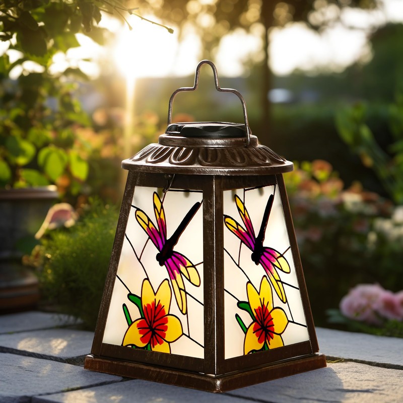 - UNIQUE SPRING CHARM: Illuminate your outdoor space with the vintage-style solar outdoor lantern, showcasing a distinctive trapezoidal design. Delicate vintage copper- yellow dragonfly gracefully hover around the petals, evoking the essence of springtime throughout the year.