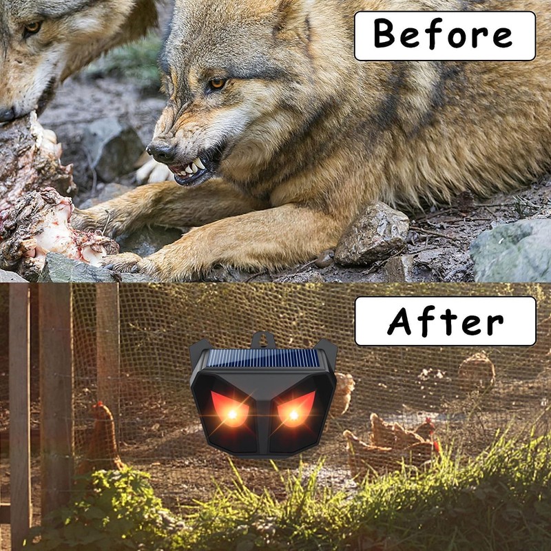 - Unique Simulation Design: Our solar animal repeller employs a dual strobe light system that emits red dazzling lights at night, mimicking the appearance of bonfires and predator eyes. This effectively deters nocturnal animals like coyotes, deer, wolves, foxes, raccoons, skunks, and more.