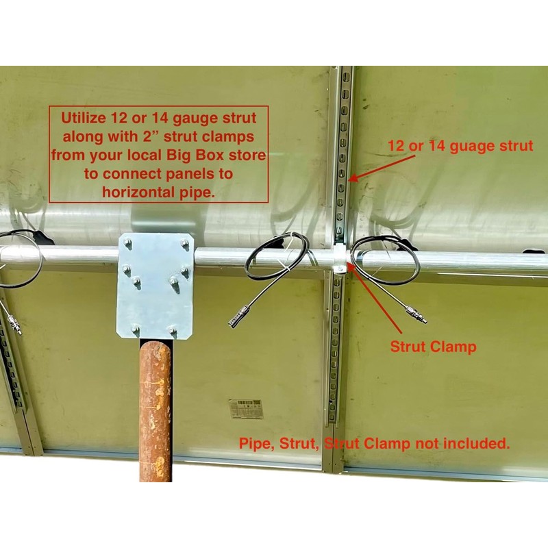 - Includes heavy duty steel bracket and u bolts to attach to 2" (2 3/8" OD) horizontal and 2" ( 2 3/8" OD) or 2.5" (2 7/8" OD) or 3" (3.5” OD) ground mounted Schedule 40 pipe. PIPE/STRUT/CLAMPS NOT SUPPLIED.