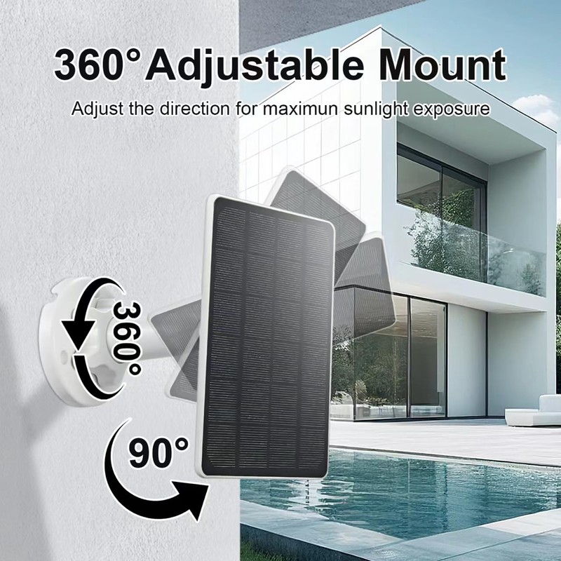 - 【Package Include】2x 5W Solar Panel, 2 X 3m(9.8ft) Cable, 2 X 360-Degree Mounting Bracket, 2 pack of screws, Camera Not Included.