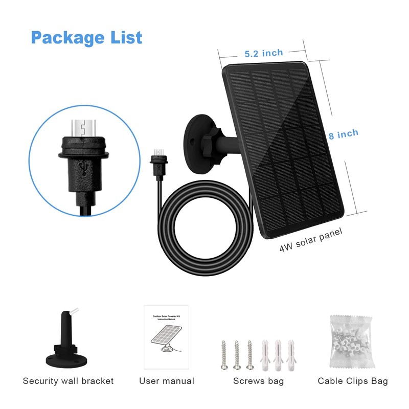 - Package includes: 1 x solar panel for flashing camera, 1 x waterproof rubber plug, 1 x 360° adjustable wall mount, 1 x cable clamp bag, 1 x screw bag, 1 x user manual (English language not guaranteed).