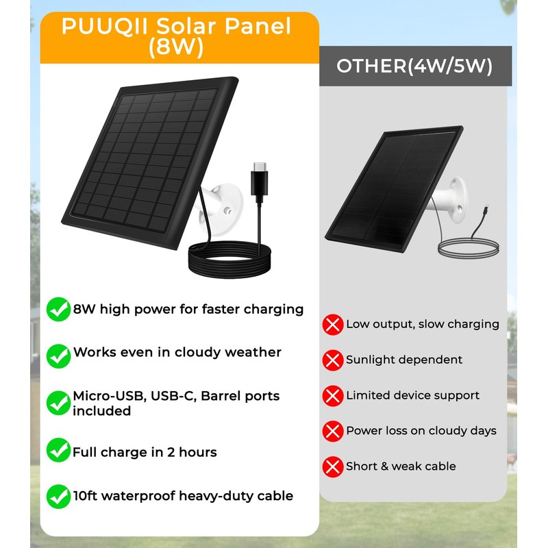 - 116% Faster Charging: 8W high-efficiency monocrystalline solar charger fully charges camera batteries in 2-3 hours under sunlight, saving the trouble of frequent charging of wireless cameras. Stable output even in rain/snow (-20°C~50°C) for 24/7 surveillance