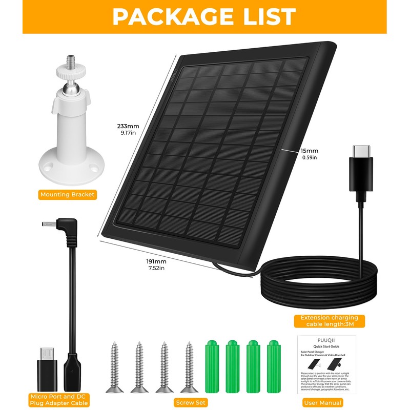 - Packing List: 1*Panel Solar for Ring Camera, 1*10ft Type C cable, 1*360° rotating mounting bracket, 1*DC plug adapter cable, 1*Micro adapter, 4*screws set, 1*instruction manual.