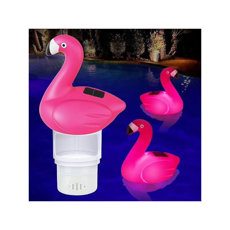 Solar Pool Chlorine Floater, 7 inch Flamingo Chlorine Floater with Light, Glow in Dark Chlorines Tablet Floater, Adjustable Release and Easy Opening Floating Chlorine Dispenser for Pool,Hot Tub