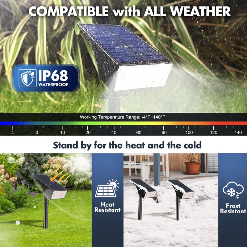 • IP68 Waterproof for All-Weather Durability: Designed to withstand the elements, our solar spot lights feature an IP68 waterproof rating. Rain or shine, these lights will continue to perform, making them ideal for any outdoor environment, including gardens, landscapes, and yards.