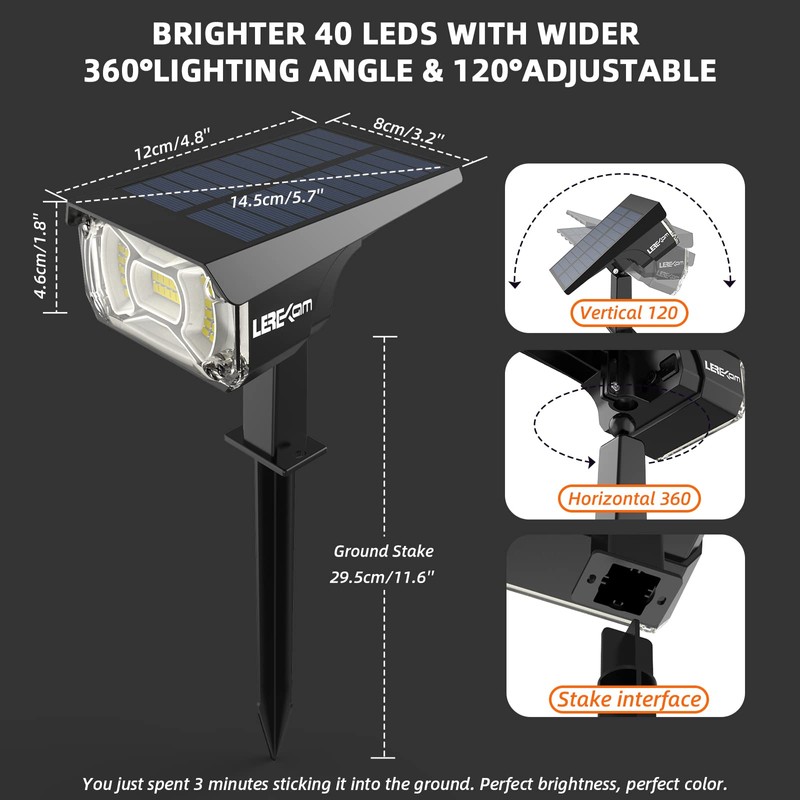 - 【360°Adjustable Solar Panel & IP65 Super Waterproof】LEREKAM outdoor spot lights for yard could help to light up your front yard, garden and landscape 360°all around, even help to light up narrower or farther places with its horizontal 360°adjustable solar panel & 120°rotatable lighting head; Up to IP65 higher-level waterproof rating, the solar lights outdoor garden could withstand all kinds of terrible weather such as rain, snow, frost, heat, bearing the working temperature range from -20℃-50℃.