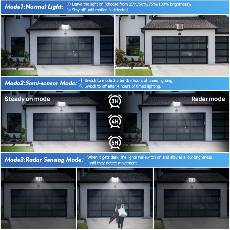 • 【6-Lighting Modes】 Mode ①: Maintains low brightness until motion is detected; Mode ②: Remains off until motion is detected; Mode ③: Switches to Mode 1 after 3 hours of timed lighting; Mode ④: Switches to Mode 1 after 5 hours of timed lighting; Mode ⑤: Switches to off after 4 hours of timed lighting; Mode ⑥: Remains on for continuous lighting (with brightness options of 25%/50%/75%/100%)