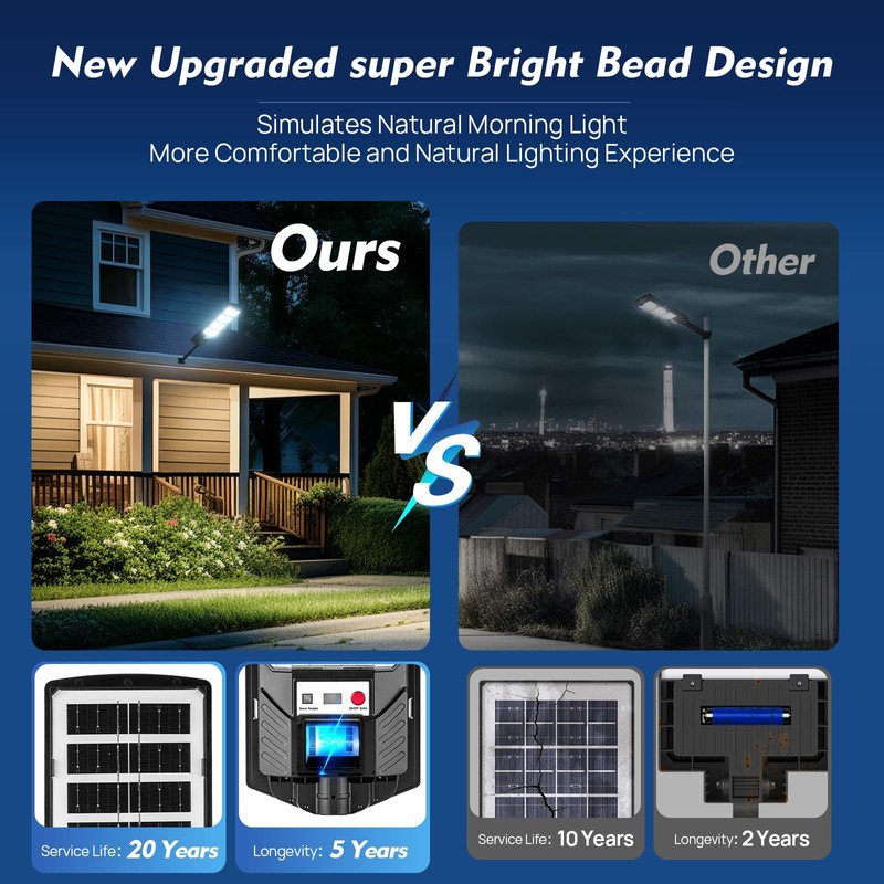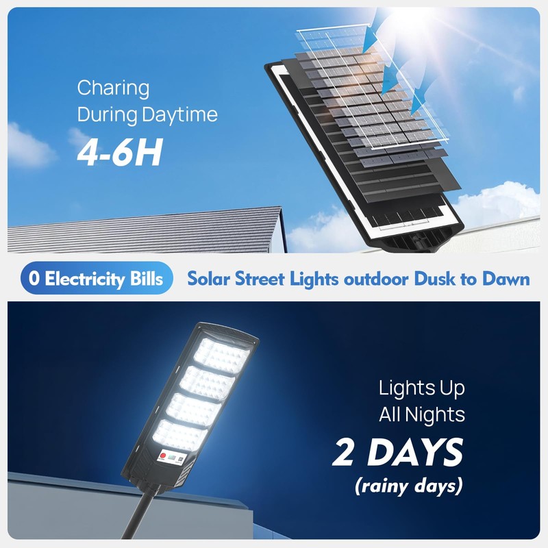 • 【Ultra-bright & Efficient】This solar outdoor street light is equipped with high-efficiency solar panels and high-brightness ‌LED beads with a service life of over 50,000 hours. With sufficient sunlight, it takes just 4–6 hours to fully charge, providing up to 10 hours of lighting at night