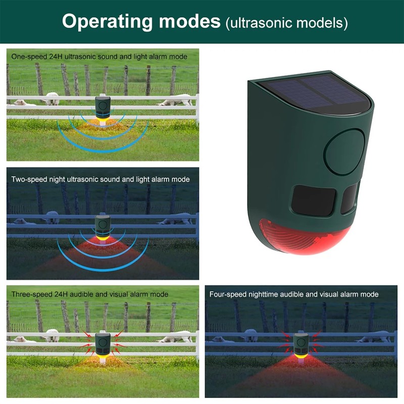 - Flexible Operation Modes: Choose the perfect setting for your needs: Mode A offers 24-hour ultrasonic sound and light alarms; Mode B activates only at night; Mode C is a continuous sound and light alarm mode; while Mode D operates only during nighttime.