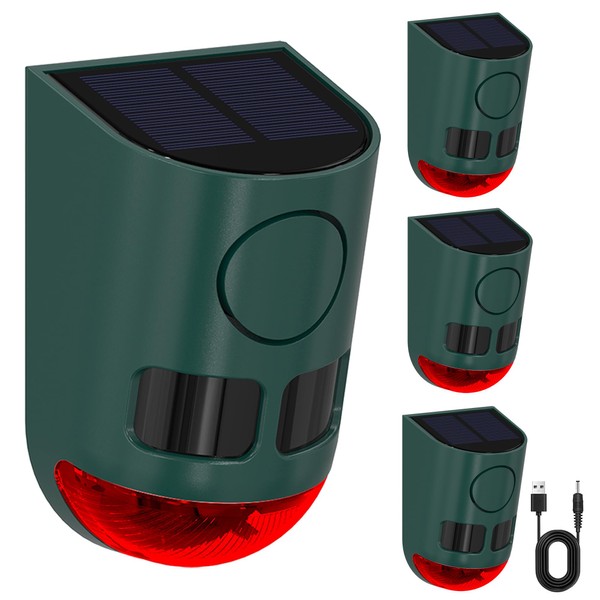 Solar Strobe Light Motion Detector Alarm: Dog Barking and Gunshot Sound, 13 Kinds of Warning Sound Loop Playback, 130db Noise Maker, Waterproof for Home, Farm - USB Charging (4Pack-Green)